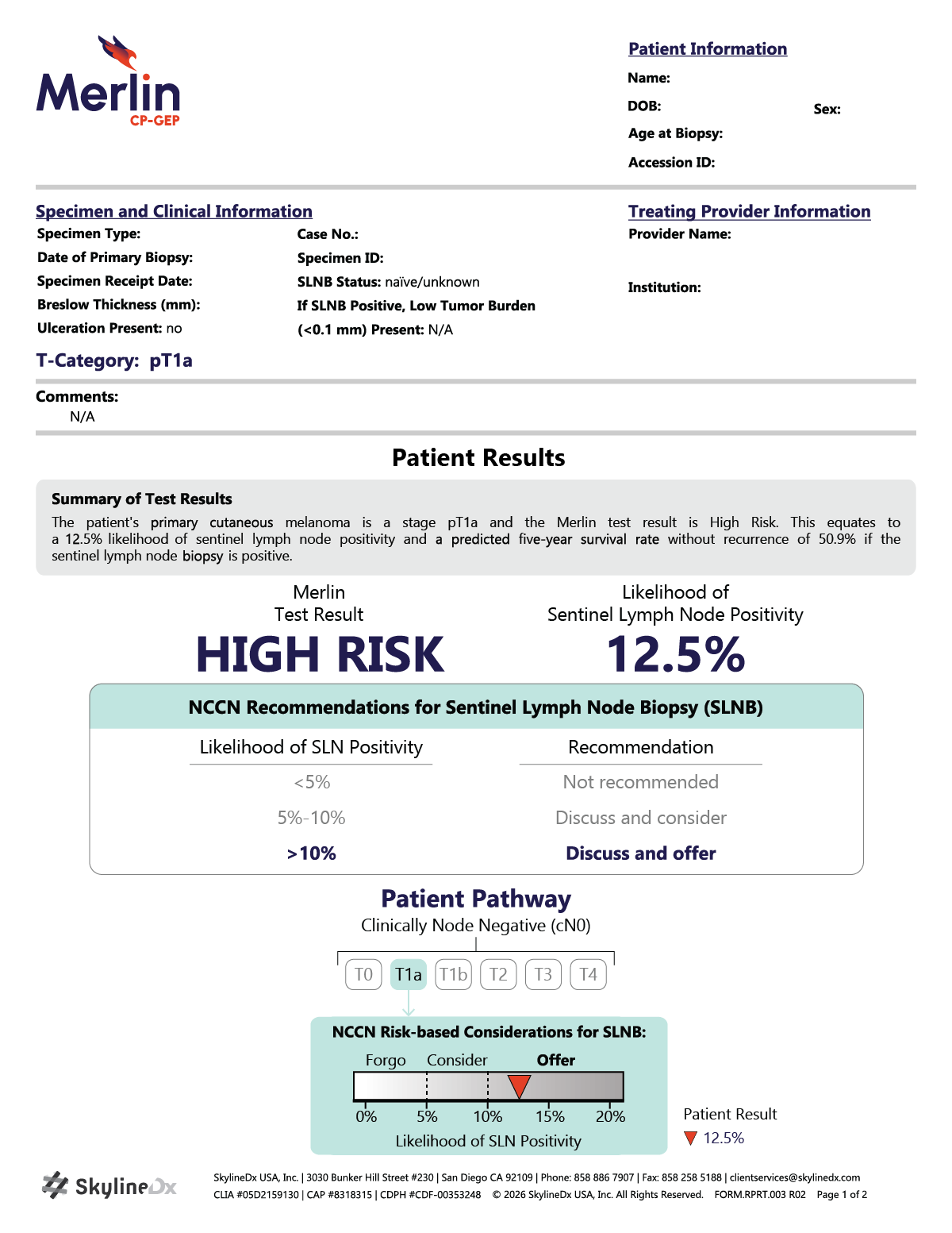 Current treatment decisions often rely on clinicopathologic factors such as patient age, Breslow thickness, and ulceration. While important, these variables alone do not always capture the full picture of a patient’s melanoma or their individual risk. The Merlin Test offers a more comprehensive understanding of your patient’s cancer – without requiring any additional procedures.